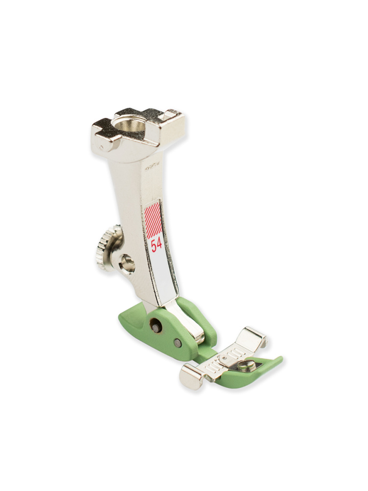 Как и лапка для вшивания молнии №14D, лапка №54 оснащена переставляемой направляющей на верхней стороне, что позволяет прокладывать идеально параллельные строчки при пришивании молнии, кантов или декоративных элементов. Это особенно удобно при выполнении точных и симметричных швов.