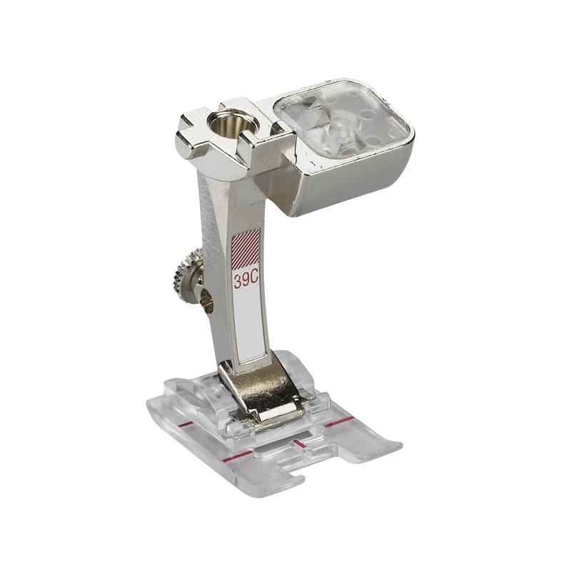 Лапка для вышивки BERNINA 39С выполнена с подошвой из прозрачного пластика, за счёт чего позволяет полностью контролировать рабочее место вокруг иглы. Посередине лапки расположено маленькое отверстие для обшивки вкладной нити. Применяйте эту лапку для получения фестонов, валиков из глади, притачивания аппликаций и мерсеризированных нитей, а также других отделочных строчек.