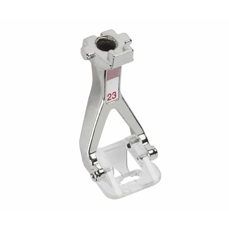 Лапка для аппликаций #23 – настоящий специалист в пришивании аппликаций узким гладьевым валиком (до 2 мм). Благодаря своей изящной конструкции она обеспечивает лёгкое и точное продвижение ткани даже при выполнении очень плотных строчек. Специальное углубление на передней стороне лапки позволяет использовать вкладную нить, что делает возможным аккуратное выполнение гусеничных швов с дополнительной нитью.
