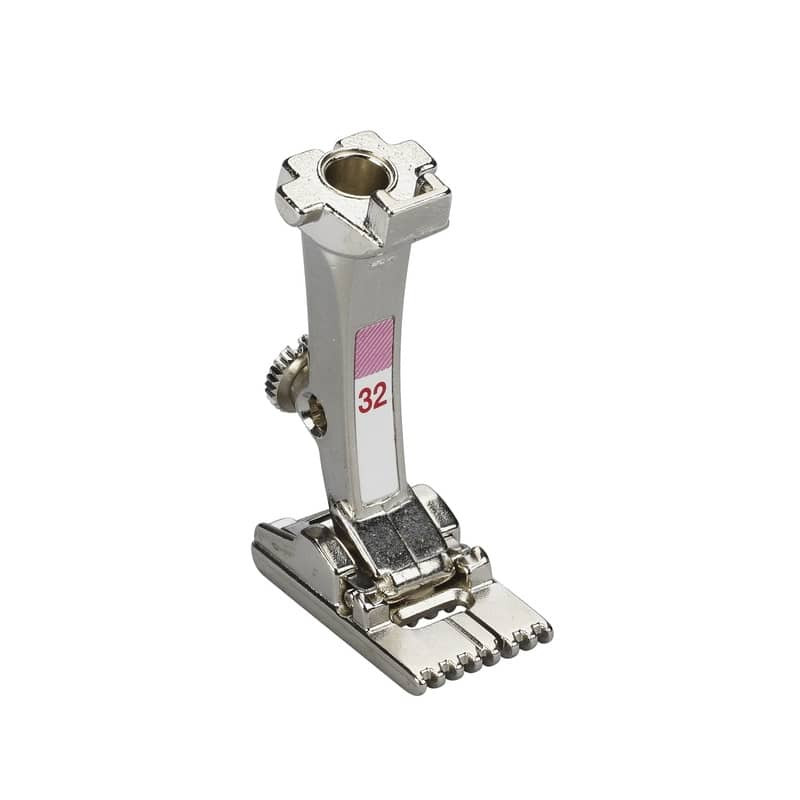 Лапка для застрачивания защипов с 7 желобками #32 – настоящий специалист в создании тонких и аккуратных защипов на лёгких и тканях средней плотности. Работая с двухстержневой иглой, она формирует характерные защипы: нижняя нить стягивает обе линии шва, придавая изделию выразительный рельеф.