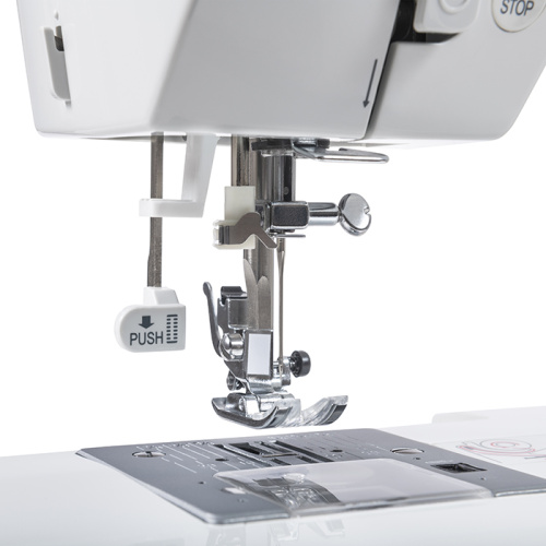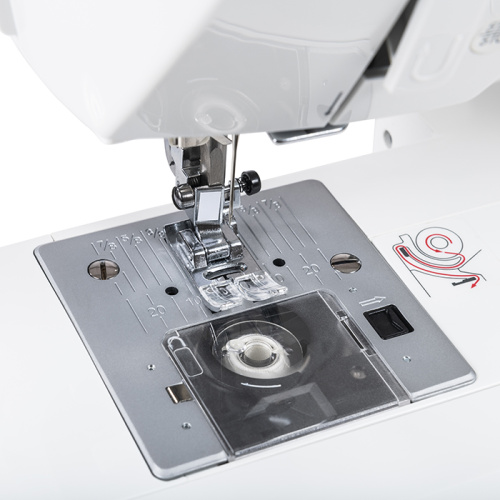 Комплект принадлежностей: универсальная лапка, лапка для автоматического выметывания петли, лапка для втачивания молнии, лапка для пришивания пуговиц, оверлочная лапка, лапка для декоративных/вышивальных строчек, лапка для потайной строчки, набор игл, кромконаправитель, дополнительный катушкодержатель, щетка/вспарыватель, шпульки - 4 шт, отвертка (большая и малая), L-отвертка, фетровая прокладка, дополнительный стержень катушкодержателя , фиксатор для катушкодержателя, набор ниток, педальный пускатель.