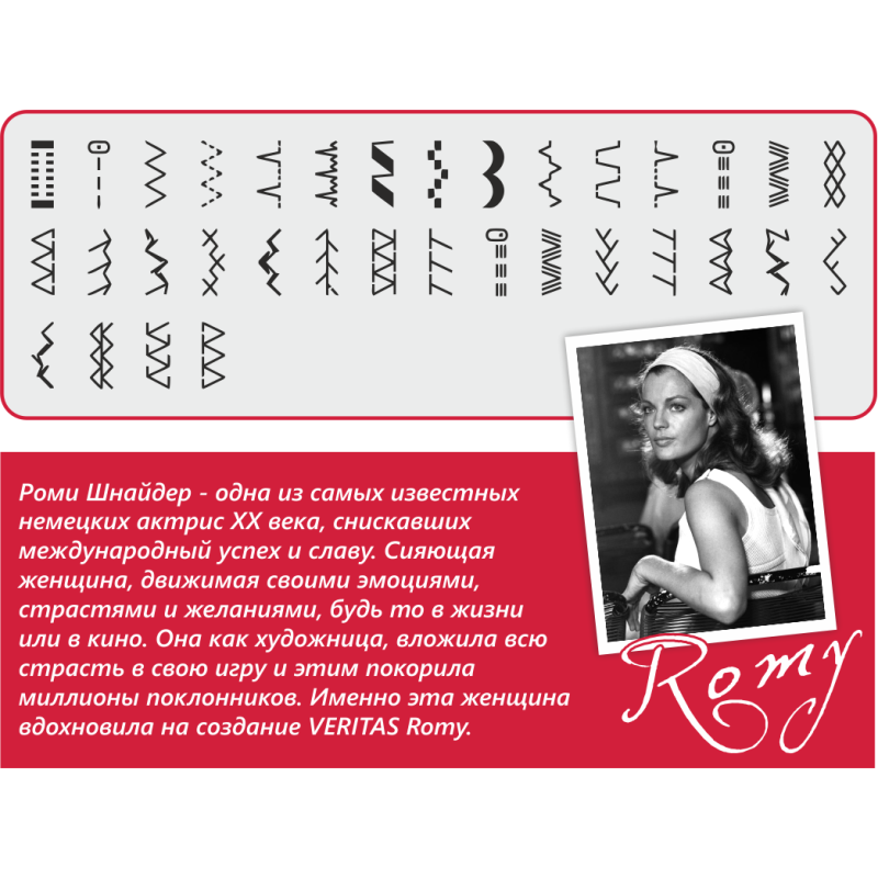 Швейная машина VERITAS Romy, была названа в честь немецкой актрисы ХХ века - Роми Шнайдер (Romy Schneider). Сияющая женщина, движимая своими эмоциями, страстями и желаниями, будь то в жизни или в кино. Она как художница, вложила всю страсть в свою игру и этим покорила миллионы поклонников. Именно эта женщина вдохновила на создание VERITAS Romy.