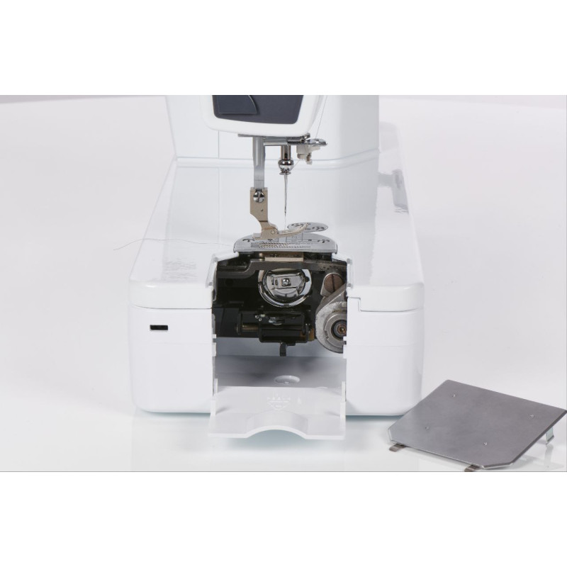| Комплект принадлежностей | Лапка для прямой строчки, узкая лапка для прямой строчки, игольная пластина для шитья тонких тканей, 4 шпульки, набор игл BERNINA, педаль, сетевой шнур, большой приставной столик, коленоподъёмник, набор ниток Mettler |